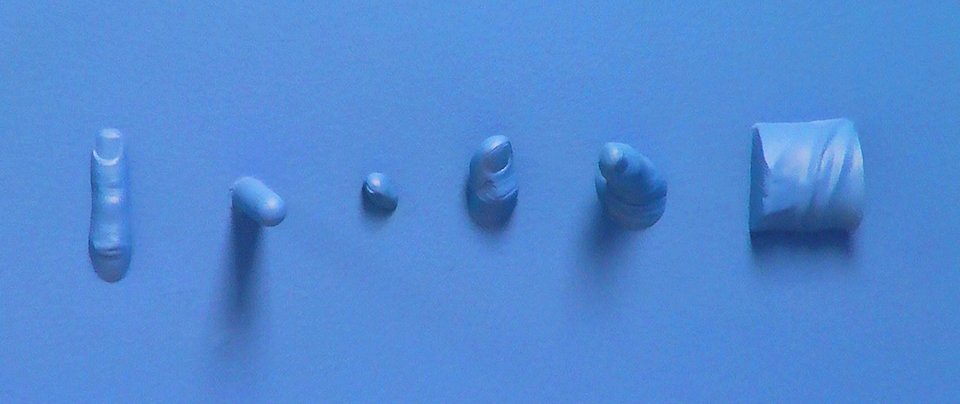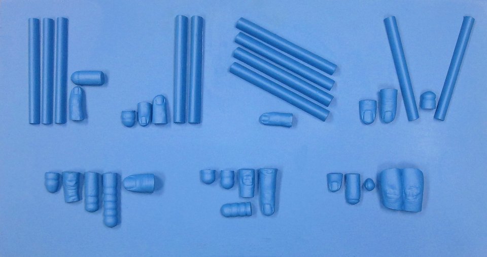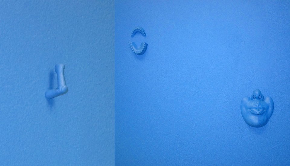 Man Up • 2015 • plaster, ceramic, sound, remote control truck • dimensions variable • sound sourced from several prime time television series, emitted at various auditory levels from a blue tooth speaker attached to the rc truck featured on the left video. Middle video pans across casts on wall. In right video, viewers were periodically invited to turn off lights, pick up provided protectors and cast abstracted home videos around the room.